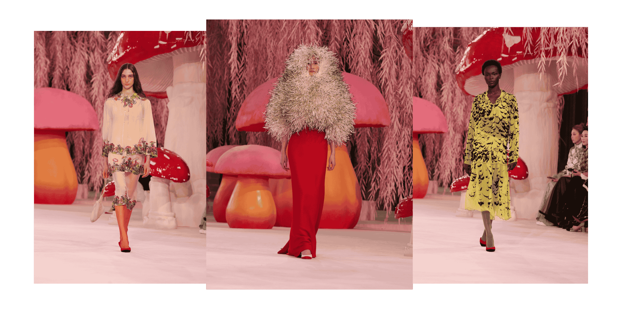 And over at Chanel, a similar vein of inspiration continues, as Matthieu Blazy’s first Haute Couture show put birds front and centre, staging the collection in a whimsical landscape of oversized mushrooms and pink willow. “A host of birds appear from the domestic to the exotic: the simple grey pigeon to the extravagant pink spoonbill; the linear heron to the crested cockatoo. Like a conspiracy of ravens, or a mischief of magpies, the birds congregate around towering mushrooms in an enchanted willow wood, then disappear, free to fly away,” reads the show notes.
